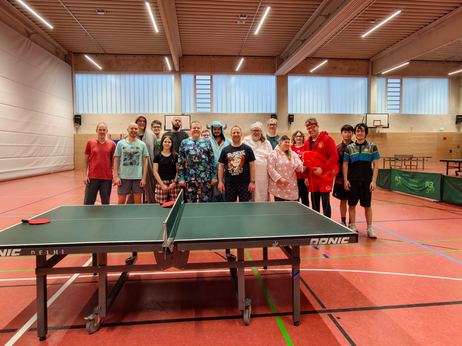 Wenn Sulley (Monster-AG) auf Dinosaurier trifft oder Popeye auf einen grauen Schlaf-Jumpsuite, dann weiß jeder Spieler-/in der Tischtennisabteilung des MTV Rheinwacht Dinslaken, dass das Jahr so langsam zu Ende geht und das alljährliche Pyjama-Turnier wieder vor der Tür steht. Am vergangenen Samstag, den 27.12.2025 um 13 Uhr, trafen sich insgesamt 17 Spieler-/innen bestens gelaunt um an der vierten Auflage des Pyjama-Turniers teilzunehmen. Die jeweiligen Spielpaarungen wurden dabei in jeder Runde ausgelost. Neben dem Pyjama und der zufällig ausgelosten Begegnungen kam erschwerend hinzu, dass nicht zum eigenen Schläger gegriffen werden durfte, sondern auf jeder Platte unterschiedliche Schläger zum Spielen bereit lagen. Ob Outdoor, Beach, Mini oder Noppenschläger es waren wieder sämtliche Schlägerarten vertreten. Was die Hauptattraktionen, die Pyjamas angeht, hat sich jeder Spieler-/in wie immer mächtig ins Zeug gelegt. Neben dem Spaß am Spielen, versüßten abseits der Platten auch wieder einige kulinarischen Köstlichkeiten den Nachmittag. Sportlich gesehen konnten sich Daniel Balduin und Thorsten Kamp mit insgesamt je neun Siegen durchsetzen. Für den besten Pyjama wurde Jörg Klockmann geehrt. „Ich bin sehr zufrieden mit dem Turnier. Ich hätte mir gerne mehr Teilnehmer-/innen gewünscht. Aber wir hatten leider viele krankheitsbedingten Absagen, was man leider zu dieser Jahreszeit nicht verhindern kann. Danke an alle, die wieder Essen und Trinken mitgebracht haben.“, so Organisator und Sportwart Marc Grunwald über das diesjährige Pyjama-Turnier. Insgesamt war eine ausgelassene Stimmung in der Tischtennishalle an der Hagenschule zu vernehmen, weshalb wir uns auch im nächsten Jahr auf ein tolles Pyjama-Turnier freuen können.